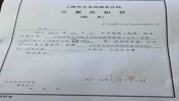上海市公安局浦东分局的立案通知书。