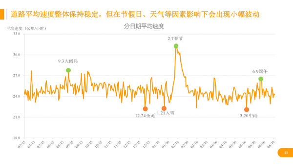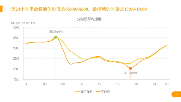 最畅通的时段是清晨5点到6点,车均时速达到35.2公里/小时,最拥堵的时刻则发生在17点到18点,时速为20.3公里/小时周五晚高峰和周四早高峰最为拥堵。