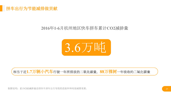 杭州地区快车累计CO2减排量3.6万吨,相当于近1.7万辆小汽车行驶一年,88万棵树一年吸收CO2量。
