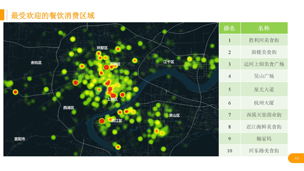 最受欢迎美食地,胜利河美食街、西溪天堂商业街和近江海鲜美食街。