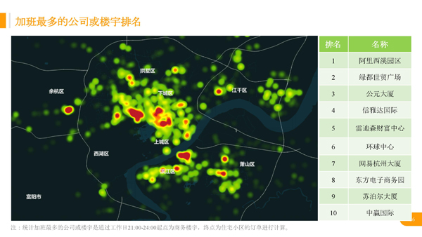 下班最晚的公司或地区排名:阿里巴巴西溪园区、绿都世贸广场、星光国际广场。
