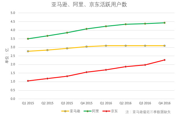在这三者里面,活跃用户最多的,是阿里,最新的活跃用户数高达4.5亿人,然后是亚马逊和京东,超过3亿和2亿人,三者之间都有着一定的差距。