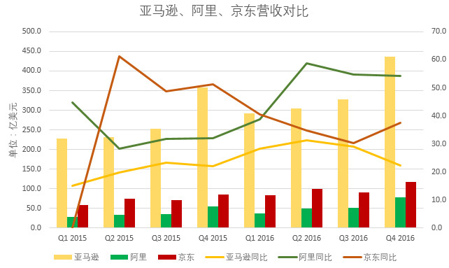 不过亚马逊毕竟是其中发展历史最久远的,亚马逊成立于1995年,而另外两者都是1998年才创立。从增速上看,最老牌的亚马逊就成了最慢了,另外两者则是在你追我赶。