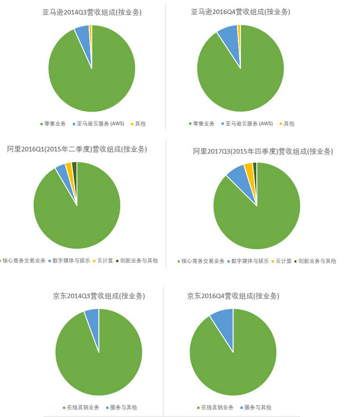 随着电商业务在发达国家和中国电商市场的红利逐渐过去,几家公司都开始寻求业务多元化,亚马逊的云服务已经在全球领先,同时也开始发力影视行业,最近还拿了个奥斯卡。阿里的路径与这有点类似,但似乎盘子铺得更大,除了云服务市场和影音市场,还有从旗下支付宝孵化出了蚂蚁金服,在金融领域逐渐深入;成立了口碑,准备以此作为线下的排头兵;还进军健康行业。