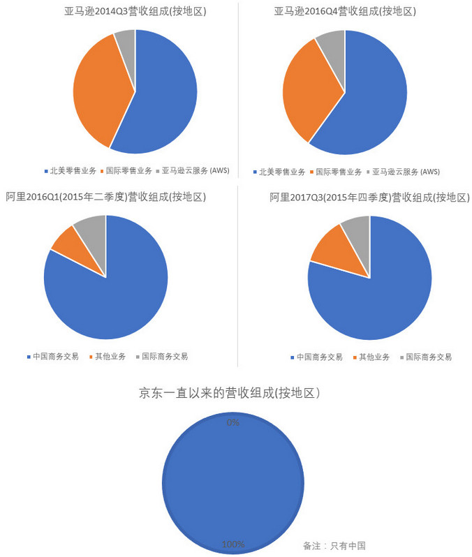 营收收入来自哪个地区,某种程度上可以反映公司业务的国际化情况。同样,三家电商都在努力往海外扩展,亚马逊目前跑的最快,国际电商业务已经占到了其应收大约三成到四成。阿里的国际电商业务接近一成,但还没有超过,这也再一次说明了国际化转型也同样是个漫长的时间。京东此前没有任何国际业务,但在最近的京东家电大会上,京东表示今年将会开始国际化业务。