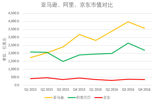 从市值上看,亚马逊的盘子最大,京东最小。能看到亚马逊的市值在这几年飙升得非常腻害,阿里跟它还有一定距离,似乎从变动上来说差异却没那么大。