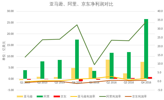 至于在净利润方面,阿里完全无论是从绝对值还是比率方面,都完全碾压另外两家。这可能跟亚马逊不断进行海外扩张有关,而阿里把不少赔钱的业务都已经独立开去了。据36氪此前分析,亚马逊的电商业务除了在北美之外,其他地方目前仍处于投入阶段,还在亏损。