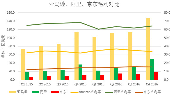 首先,营收大概是最能反映一家公司体量的指标,从此来看,国内的两家电商对比起亚马逊无疑是小巫见大巫,亚马逊的营收甚至超过另外两者之和。