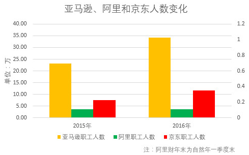 同样,因为模式的不同,亚马逊和京东的自营模式相较于阿里的平台模式更重,截止上一财年年末,亚马逊的员工总数接近35万人。京东的员工总人数为11万,其中,快递员超过8万。阿里的职工人数最少,仅有约4万人。