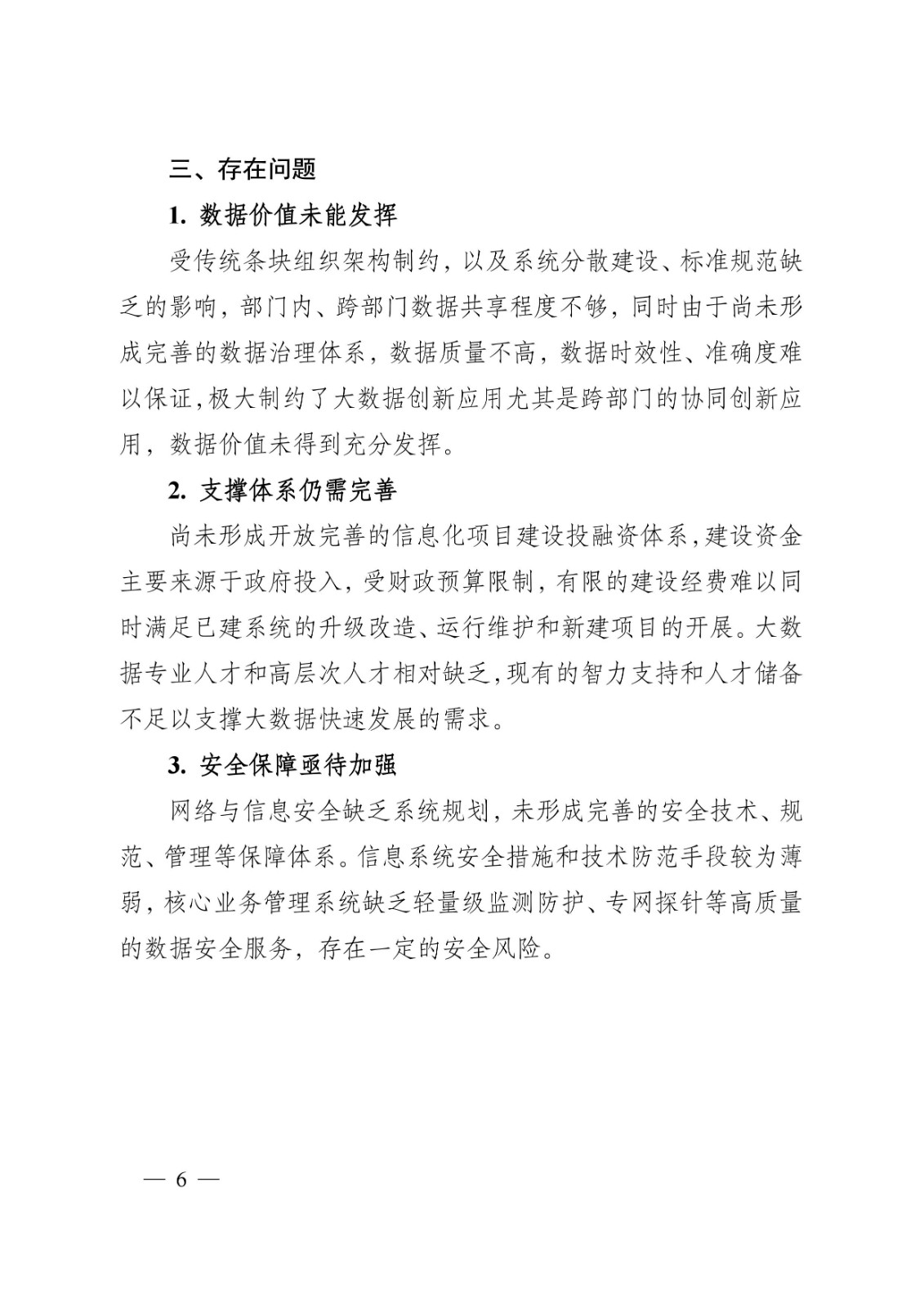 六是在安全保障专栏,打造全面可控的安全保障体系,建设电子政务外网安全防护中心,建立大数据同城双活和异地灾备机制,提升基础设施和关键设备安全保障水平,加强大数据安全规范体系和评估体系建设。