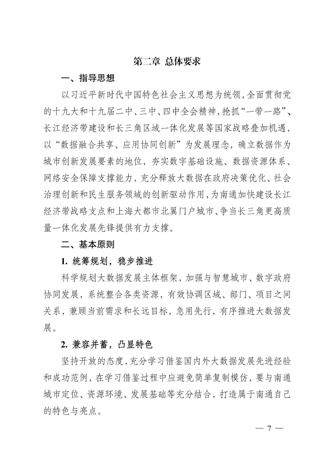 第二部分:总体要求。围绕为南通加快建设长江经济带战略支点和上海大都市北翼门户城市,争当长三角更高质量一体化发展先锋提供有力支撑这一定位,提出南通市大数据发展建设的指导思想、四项基本原则和到2021年初步形成协同互动的大数据发展格局,全面建成信息基础设施泛在先进、数据资源汇聚共享、数据应用广泛深入、支撑体系保障有力的发展格局的主要目标,以及到2025年将南通打造成为华东地区重要信息港和长三角大数据产业发展高地,大数据发展达到全国一流水平的愿景目标。
