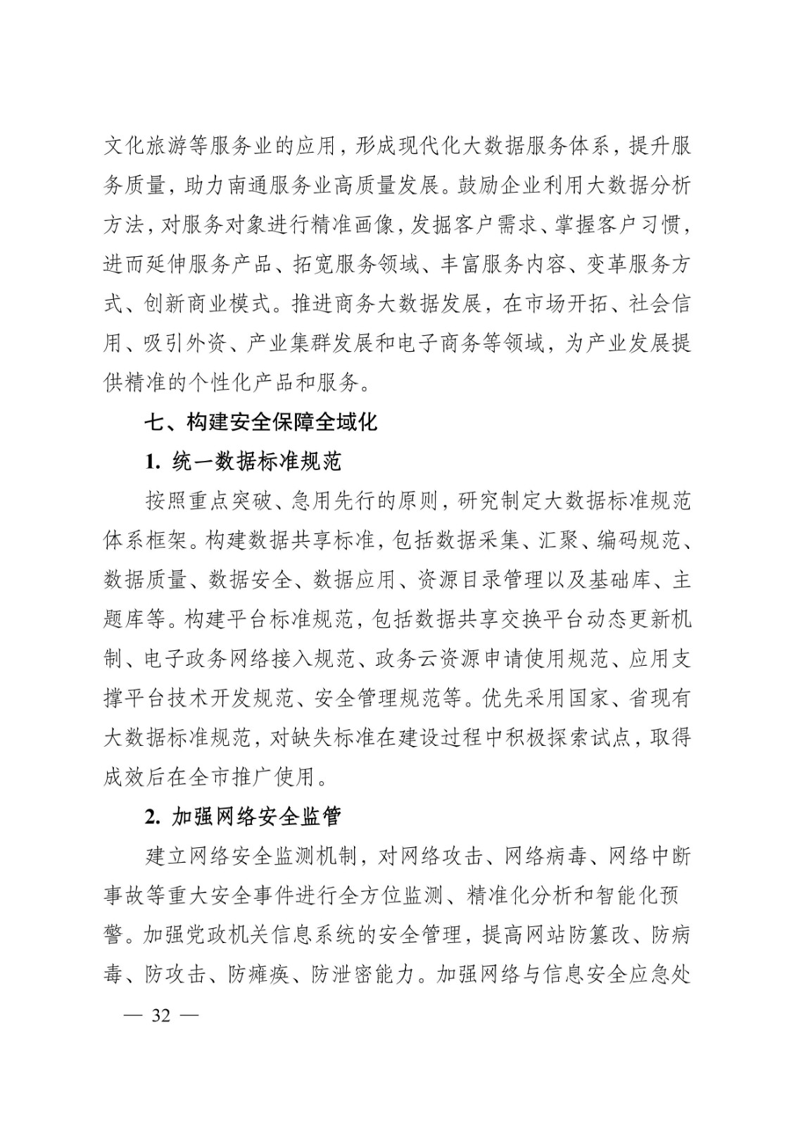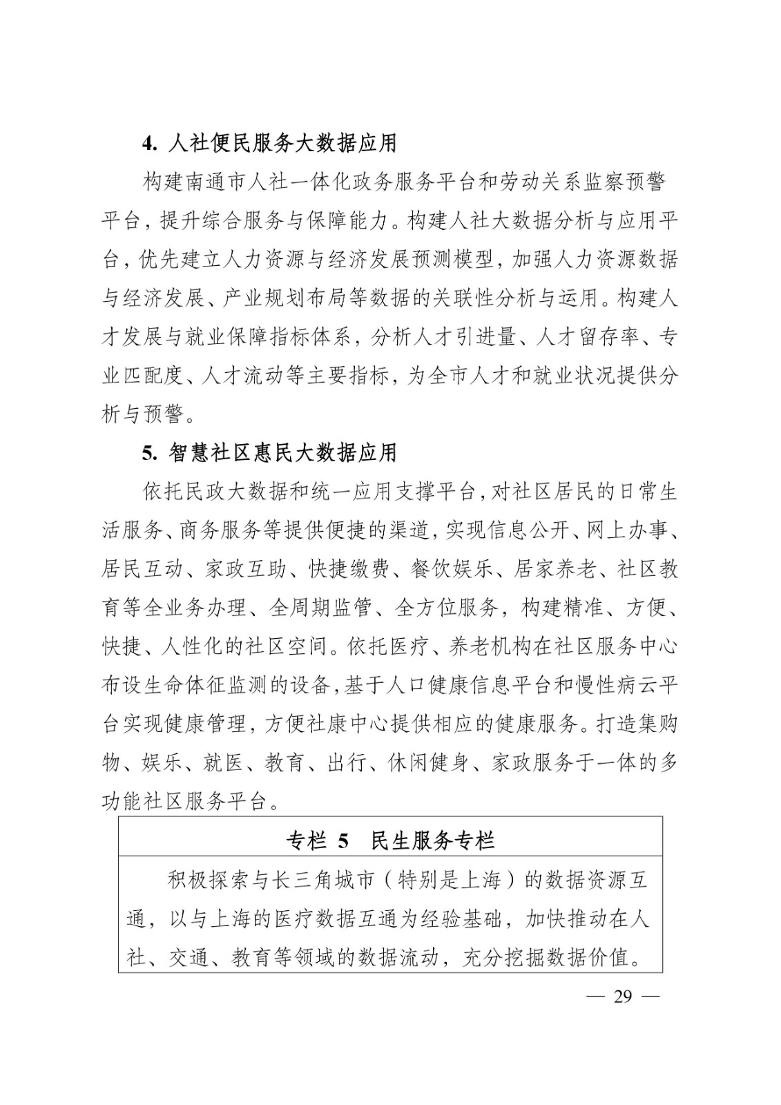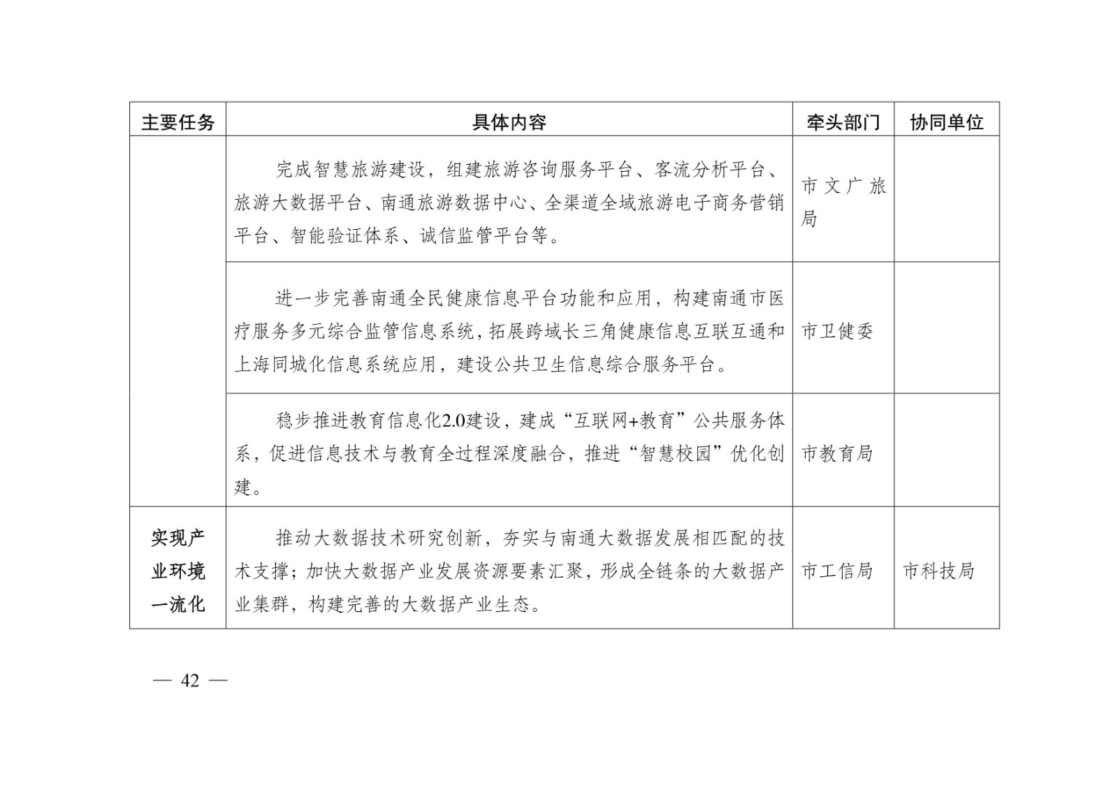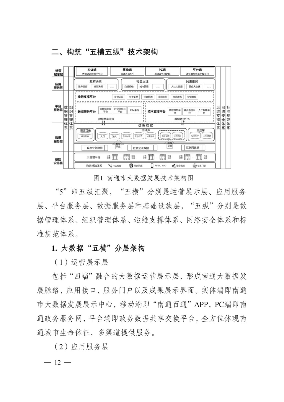 第四部分:主要任务。从加强基础设施集约化、促进数据资源一体化、推动政务服务高效化、支撑社会治理协同化、落实民生服务便利化、实现产业环境一流化和构建安全保障全域化等七个领域,提出了具体的工作方向和内容。并围绕基础设施、数据资源、政务服务、社会治理、民生服务和安全保障等六个专栏,提出了打造南通大数据亮点应用的方向和内容。