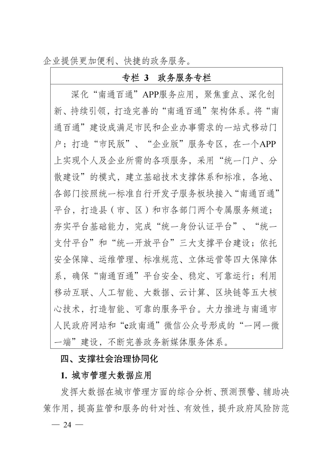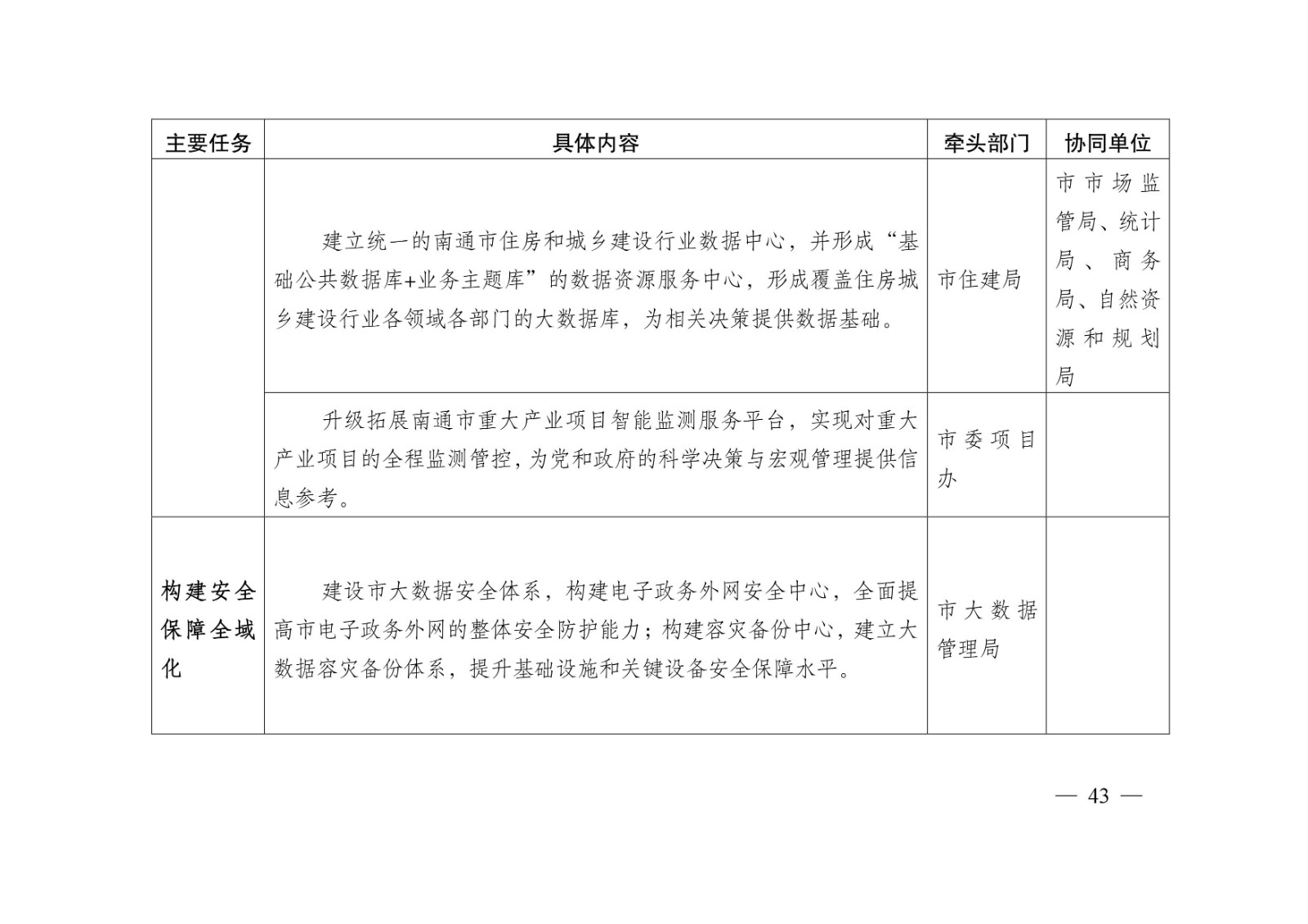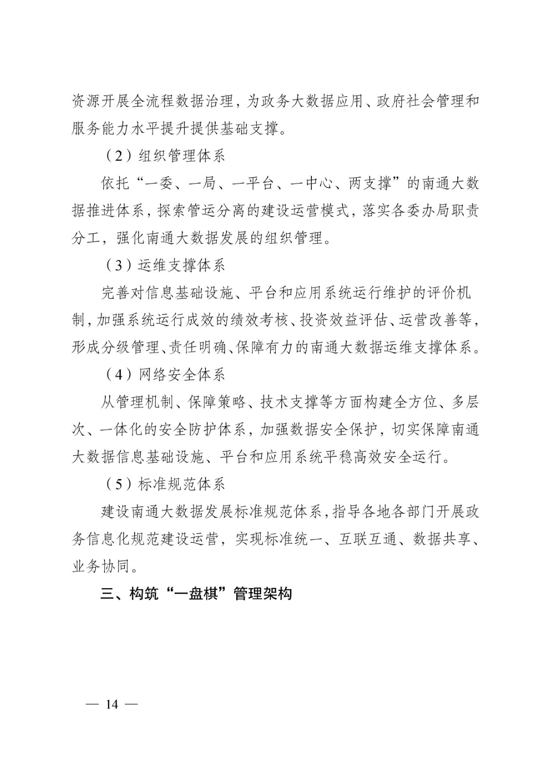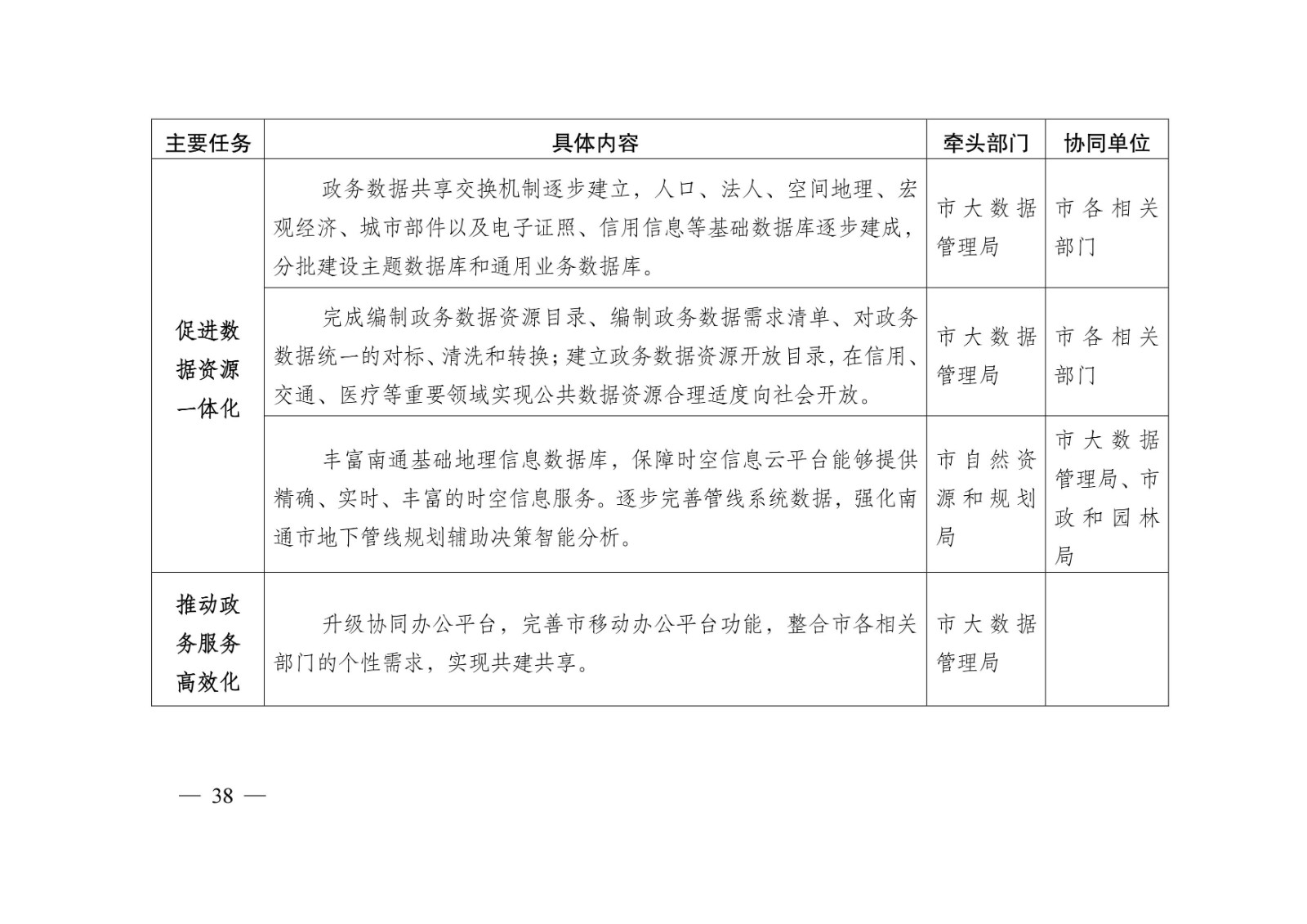 第四部分:主要任务。从加强基础设施集约化、促进数据资源一体化、推动政务服务高效化、支撑社会治理协同化、落实民生服务便利化、实现产业环境一流化和构建安全保障全域化等七个领域,提出了具体的工作方向和内容。并围绕基础设施、数据资源、政务服务、社会治理、民生服务和安全保障等六个专栏,提出了打造南通大数据亮点应用的方向和内容。