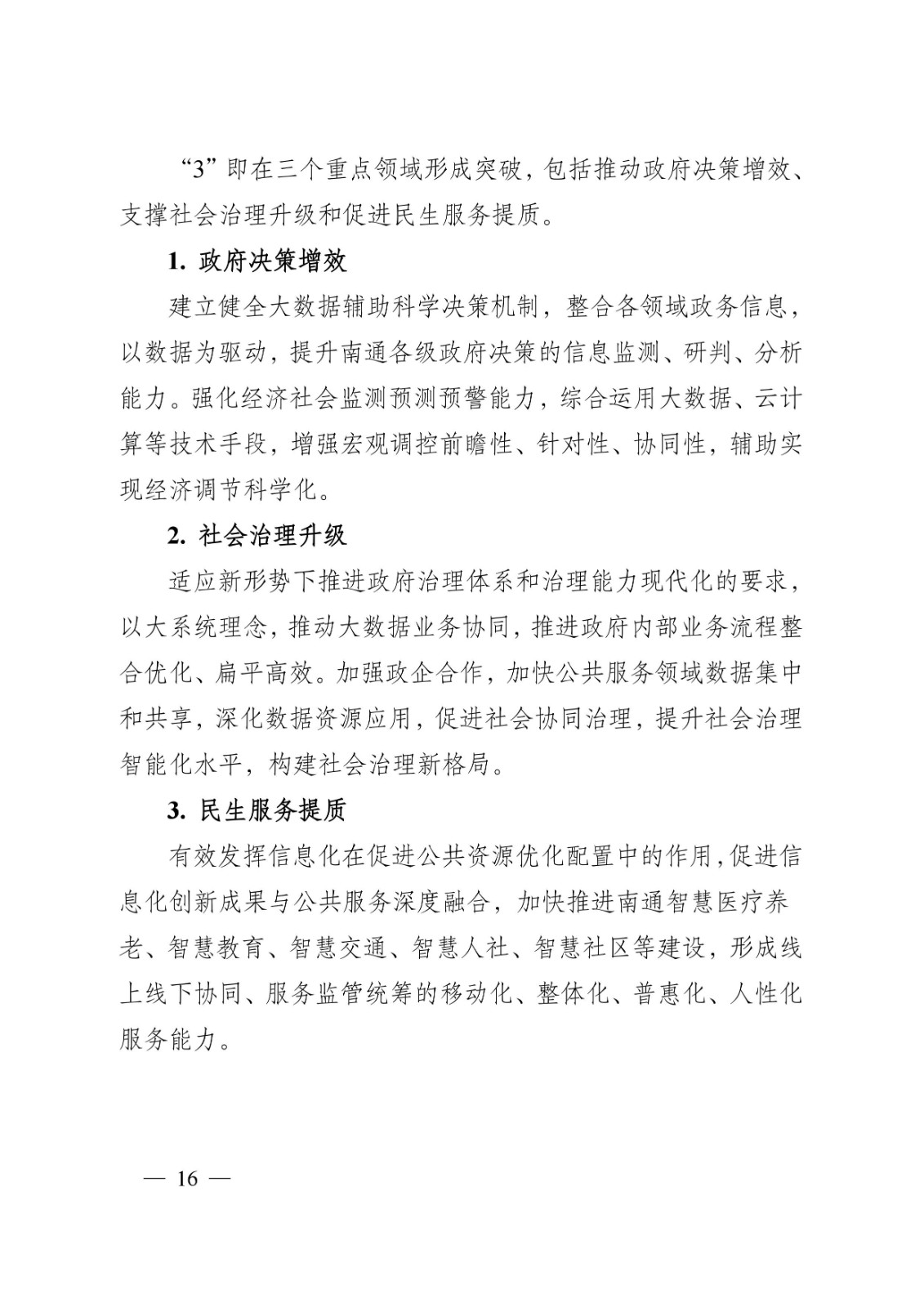 推动政府决策提效、支撑社会治理升级和促进民生服务蜕变。包括建立健全大数据辅助科学决策机制;适应新形势下推进政府治理体系和治理能力现代化的要求;加快推进南通智慧医疗养老、智慧教育、智慧交通、智慧人社、智慧社区等建设。