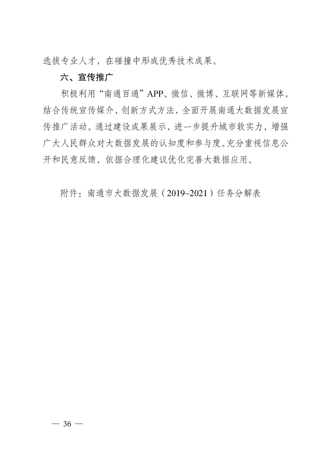 第六部分:附录。提出了南通市大数据发展(2019-2021)任务分解表,对七大领域25项主要任务进行了任务内容、责任部门和协同部门划分。