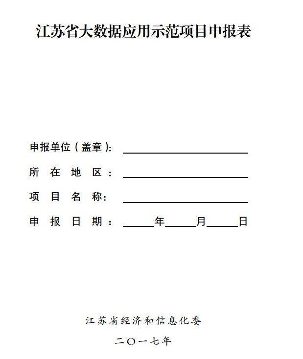 为贯彻落实《江苏省大数据发展行动计划》(苏政发〔2016〕113号),充分发挥应用示范效应,提升我省社会数据资源的开发和大数据应用水平,推动政府治理和公共服务能力现代化,促进经济社会转型升级,江苏省经济和信息化委员会决定在全省范围内开展2017年江苏大数据应用示范项目推荐评定工作,现就有关事项通知如下: