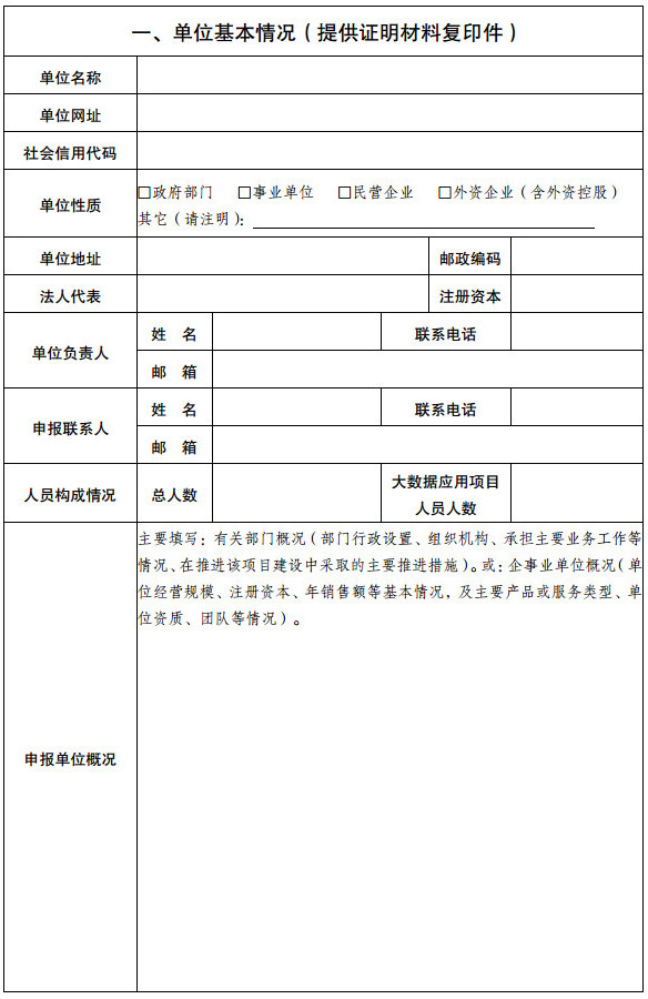 (一)申报。各申报单位填报《江苏省大数据应用示范项目申报表》(见附件)。省级申报单位(省本级,含省属单位)直接向江苏省经济和信息化委员会申报;市、县(市、区)单位向所在市信息化主管部门提出申请。