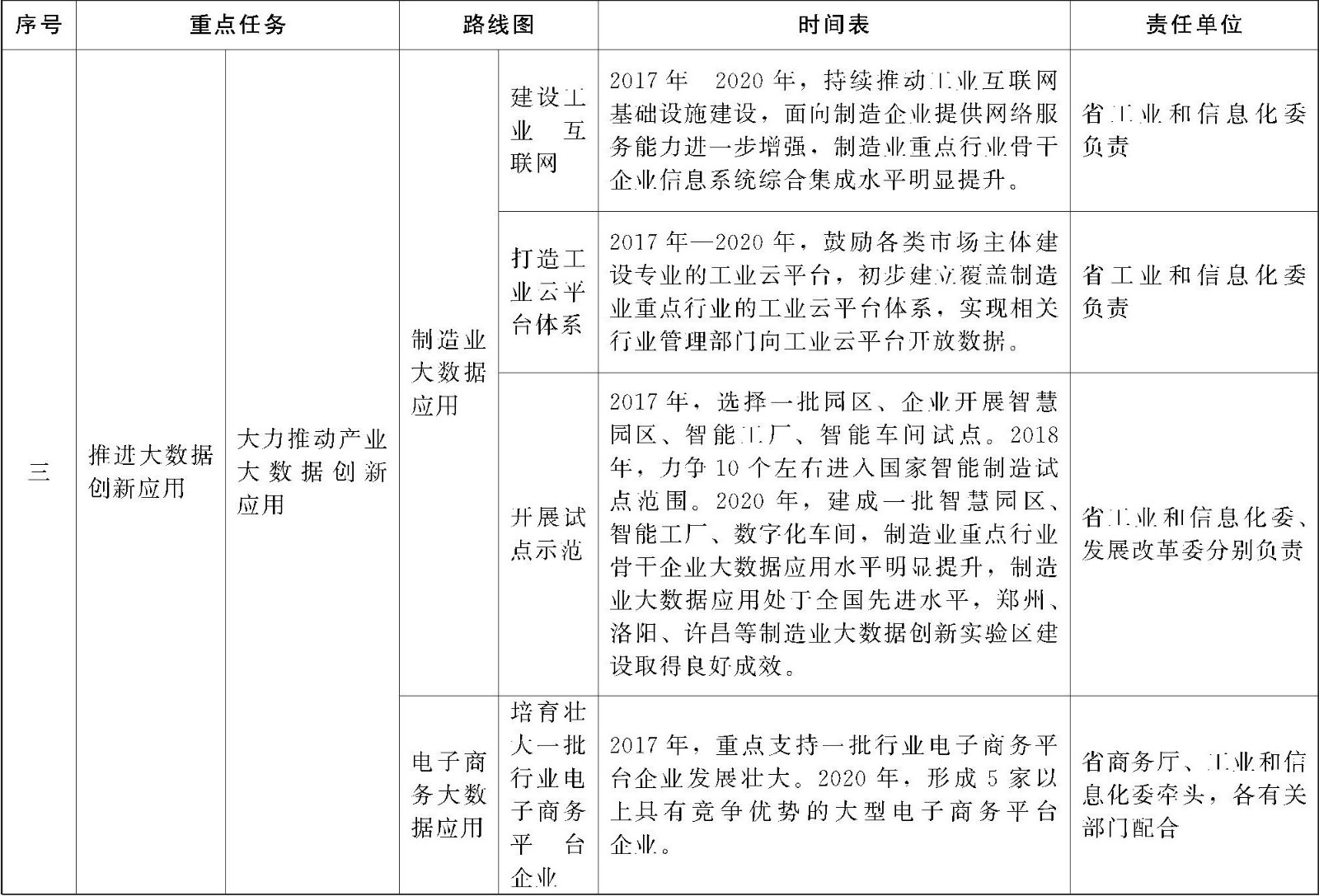 把交通物流、农业粮食作为主攻方向和突破口,在政务、益民服务、产业等领域开展大数据创新应用试点示范,推进大数据与各行业深度融合。