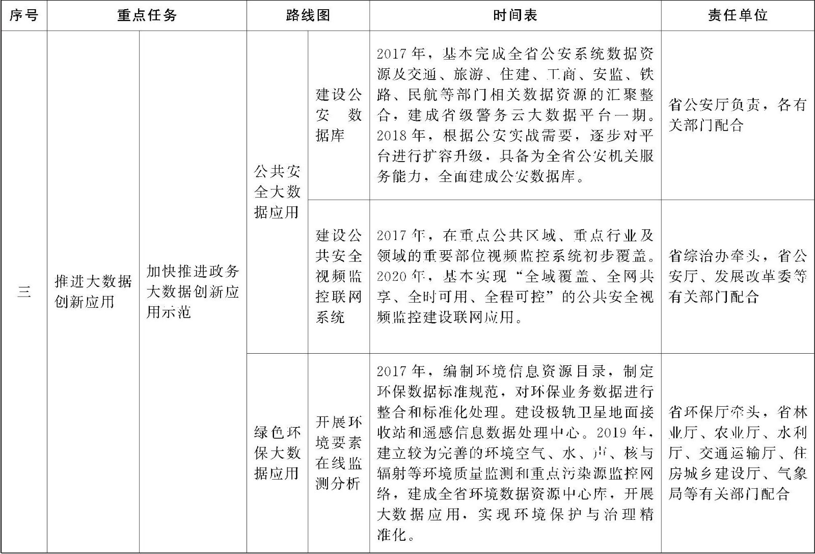 (5)公共安全大数据应用。汇聚全省公安系统数据资源,建设公安数据库,对接交通运输、民政、人力资源社会保障等部门相关数据资源,加强公共安全形势研判,为预防预警、反恐维稳与应急处突等政府决策提供技术支撑。大力推进人体生物特征识别、视频智能目标识别、激光扫描识别等技术在社会治安管理方面的应用推广。建设省、市、县、乡四级综治视联网,加快推进公安、综治等部门和企事业单位相关视频监控系统互联,建设“全域覆盖、全网共享、全时可用、全程可控”的公共安全视频监控联网系统,提高社会综合治理水平。