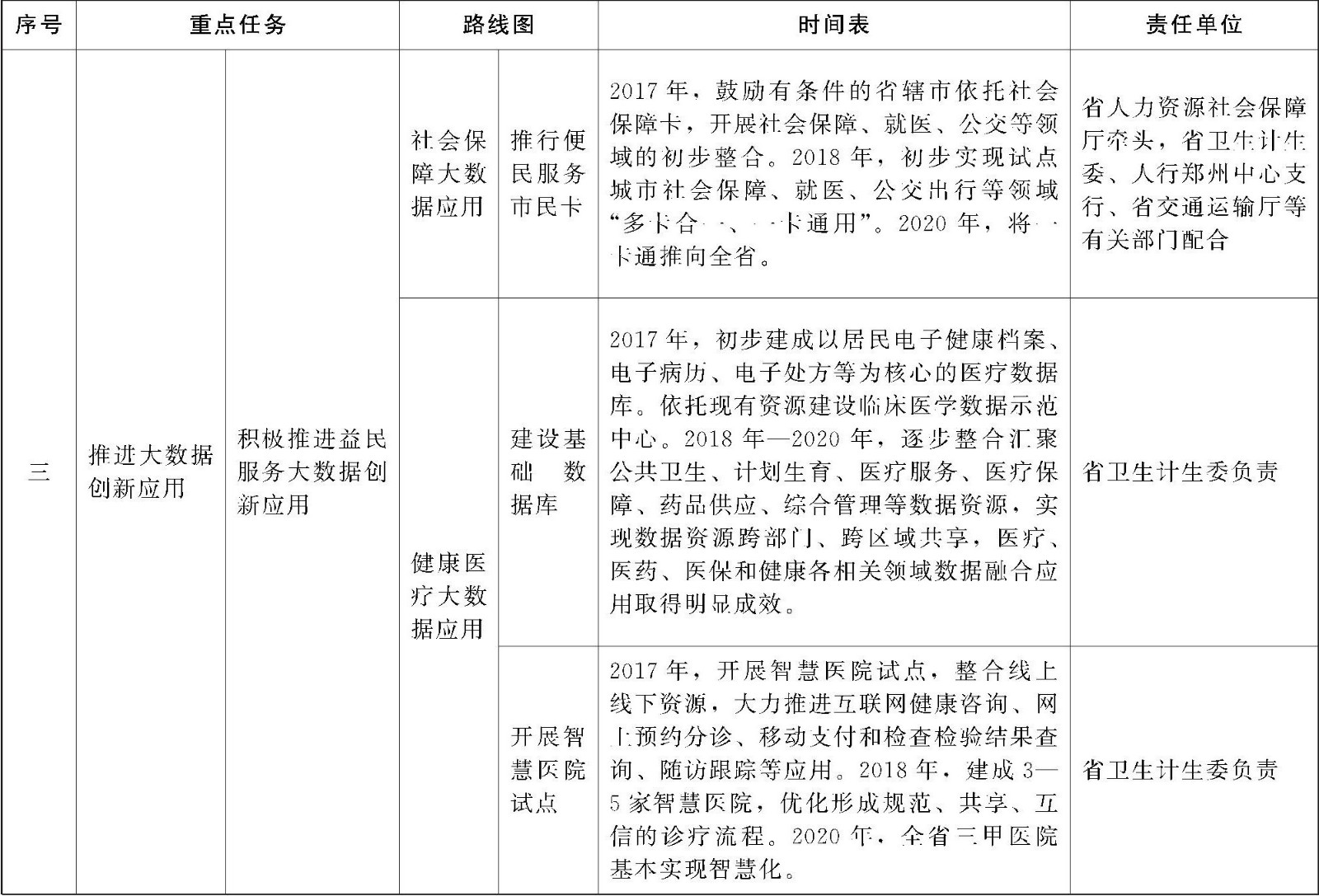 (1)社会保障大数据应用。完善社会保障卡持卡人员基础信息库,汇聚养老、医疗、工伤、失业、生育等社会保障数据,对接社会救济、社会福利、社会优抚以及住房、车管、治税等领域数据,促进跨部门、跨机构、跨层级业务融合和信息共享,开展社保审计、社保便民等大数据应用。建设省级就业信息资源库,构建“就业D图”,引导劳动者有序流动、理性择业,分类实施帮扶和精准扶持。加快推行全省统一的社会保障卡,鼓励有条件的省辖市依托社会保障卡,率先实现社会保障、就医、交通出行、银行借记支付、身份证明等领域“多卡合一、一卡通用”。