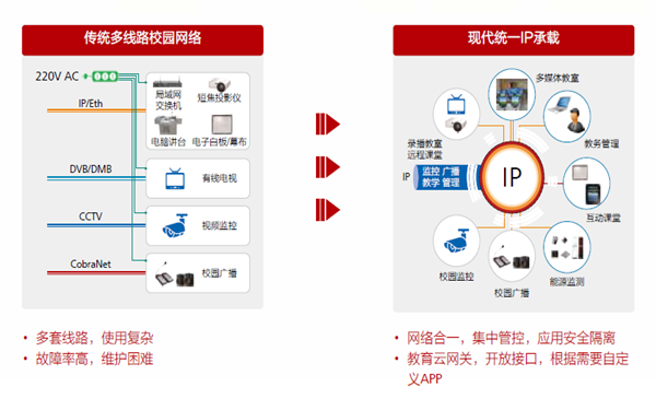 这些都是当前中国校园数字化教育的缩影。如今中小学基础教育,信息化的建设和发展已经成为学校教学活动日益重要的一部分。"科教兴国"是保证我国能够长期、稳定、高速发展的战略国策,教育信息化是让该战略国策能有效实施的重要手段之一,中小学阶段作为基础教育阶段,普及信息化教育尤为重要。校园的网络系统是中小学阶段教育信息化的基础设施和重要标志,是实施素质教育的重要手段,在中小学的发展中起着非常重要的作用,"校校通","班班通","人人通"成为部署校园网的基础要求。先进教育管理,教育公平等的推进,同样依靠先进的信息技术来保证。学校各种信息化应用的深入,让基础教育对网络的要求"水涨船高"。在校园信息化建设和拓展的过程中,师生的教学活动和办公活动已经深深根植于校园的网络建设中,新时代需要新的网络支持教育信息化,支持教育走向现代化。