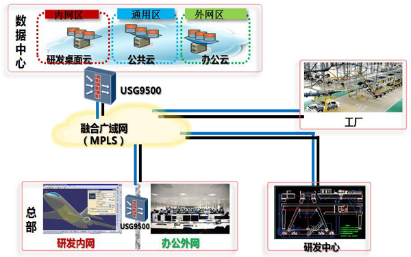 大型离散制造企业普遍采用高度并行的"产业链协同"设计模式。企业网络采用以业务中心(总部)为核心,各区域及协作单位通过租用运营商线路的方式联接到总部的网络架构。出于安全考虑,各区域或协作单位网络普遍划分为内网和外网。解决内外网隔离带来的一系列问题,将会极大地提高沟通协作效率,并降低投资成本和运行维护费用。