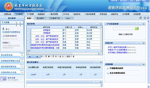 税收管理员平台是为了提高基层管理人员的工作效率,降低税收管理员的工作压力,为税收管理员以及各级机构提供一种对纳税人有效管理的手段。该平台提供任务流转、纳税评估、数据分析预警,外部数据交换,信息查询,安全管理等功能。包括:管理台账、工作事项、下户管理、税源监控、文书管理、一楼式管理、工作日志、信息核定、绩效考核、个税申报管理、异常信息、纳税评估、系统管理等模块。