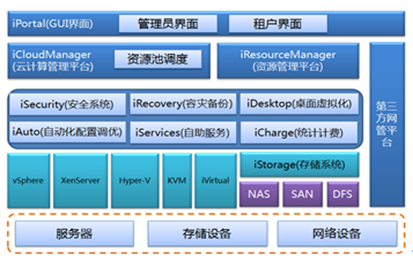 浪潮IncloudManager V3.0是浪潮自主设计的系统架构,自主研发的国产云资源管理平台,支持底层VMWare vSphere平台及浪潮自研虚拟化产品iVirtual的异构虚拟资源池,对已部署的vSphere环境无需停机即可被云海OS接管,实现对现有vSphere环境的无缝兼容,实现安全可控。