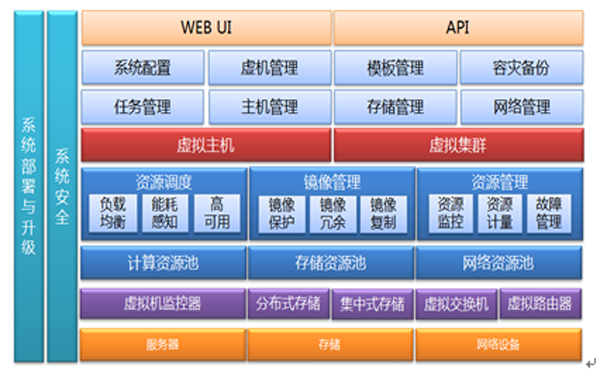 云计算操作系统指的是云计算后台数据中心的整体管理运营系统,它是指构架于服务器、存储、网络等基础硬件资源和单机操作系统、中间件、数据库等基础软件管理海量的基础硬件、软资源之上的云平台综合管理系统。云计算操作系统通常包含以下几个模块:大规模基础软硬件管理、虚拟计算管理、分布式文件系统、业务/资源调度管理、安全管理控制等几大模块组成。