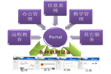 校园门户服务是数字校园的高级表现形式,凌驾于各类应用之上,作为数字校园窗口,以浏览器的方式向用户展现数字校园的应用信息,针对不同的用户,为他们提供基于个人访问权限的个性化界面和服务。为全校师生员工及校外用户提供快捷.共享.全面的信息服务。为高校实现"网上教学.网上科研.网上管理.网上服务.网上办公"。对学校而言,校园门户是对外的窗口,是宣传形象的载体。对老师.学生和学校管理人员而言,校园门户是科研.学习和管理的平台。