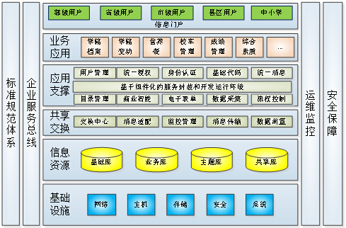 学生学籍管理信息系统总体建设框架分为:基础设施、信息资源、共享交换、企业服务总线、应用支撑、业务应用、运维监控、安全保障和标准规范体系几部分内容。