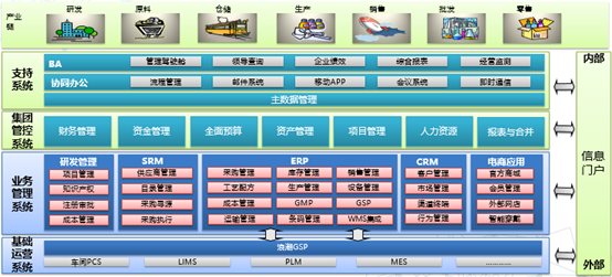 业务层:实现从采购、物料、财务、生产、质量和销售等流程的业务处理应用,强调贯彻GMP,提高业务协同和处理效率。