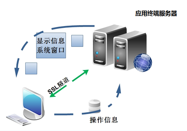 Virtual App的虚拟程序应用发布方案,在机房数据中心设置应用终端服务器,通过发布相应的应用程序,将服务端应用程序运行图像,传输至访问端,访问端采用B/S的模式打开浏览器访问应用系统,终端服务器根据接受访问端的输入、操作指令信息,如键盘、鼠标等,实现对应的响应。