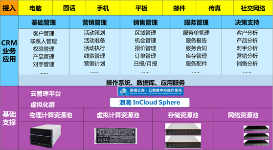浪潮CRM系统解决方案如上图所示,所有业务系统运行在由服务器、存储、网络构建的云计算基础架构平台上,CRM的业务应用主要包括基础管理、营销管理、销售管理、服务管理、决策支持五部分,接入端可以通过电脑、电话、手机、平板等与CRM系统进行接入。