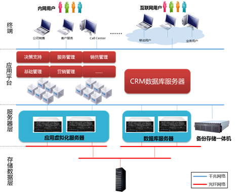 CRM系统采用2-4台Intel Xeon E7-4800V2系列的高性价比的四路服务器浪潮构建虚拟化平台,在虚拟化平台上运行相应的业务系统。CRM系统的所有应用都部署在虚拟化环境中,后续随着企业业务的发展,业务系统的增加,可以在不影响现有业务的同时无缝的横向扩展虚拟化集群。