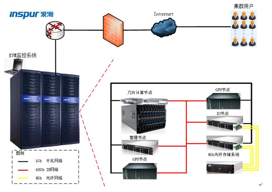 浪潮TS10K系统包含4套网络。管理网络采用万兆为主干的千兆线速网络,可开辟对教育网/公网的独立IP,实现广域网用户登录使用集群;IPMI网络采用非线速千兆交换机,互联所有节点,管理员通过办公用机可实现集群的带外管理;KVM本地监控网络通过菊花链方式,最多实现960台计算机的KVM监管;计算网络采用IB网络全线速互联,带宽达到56Gb/s,延时1微秒内,充分保证计算中间数据交互。