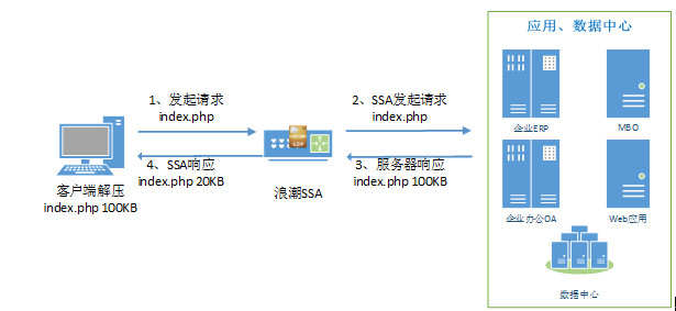 浪潮安全应用交付系统(浪潮SSA)的HTTP压缩功能,可通过标准的HTTP压缩规范自动识别客户端对gzip压缩算法的支持情况,并能够实现对数据动态压缩,以加速所有的本地、远程和移动用户提供基于 Web 的应用。