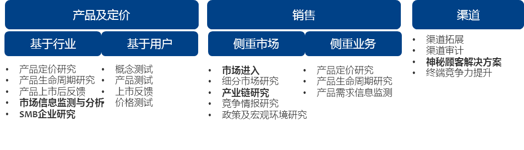 我们研究的不只是IT行业本身,我们对IT行业的上下游也有丰富和深刻的研究经验。研究范围包括上游供应商的供货能力,供应模式,价值体现等营运体系,下游渠道模式,SI系统集成商服务模式,服务外包商服务模式,下游价值链等,能够帮助各IT厂商制定更好的经营模式和合作形态等。