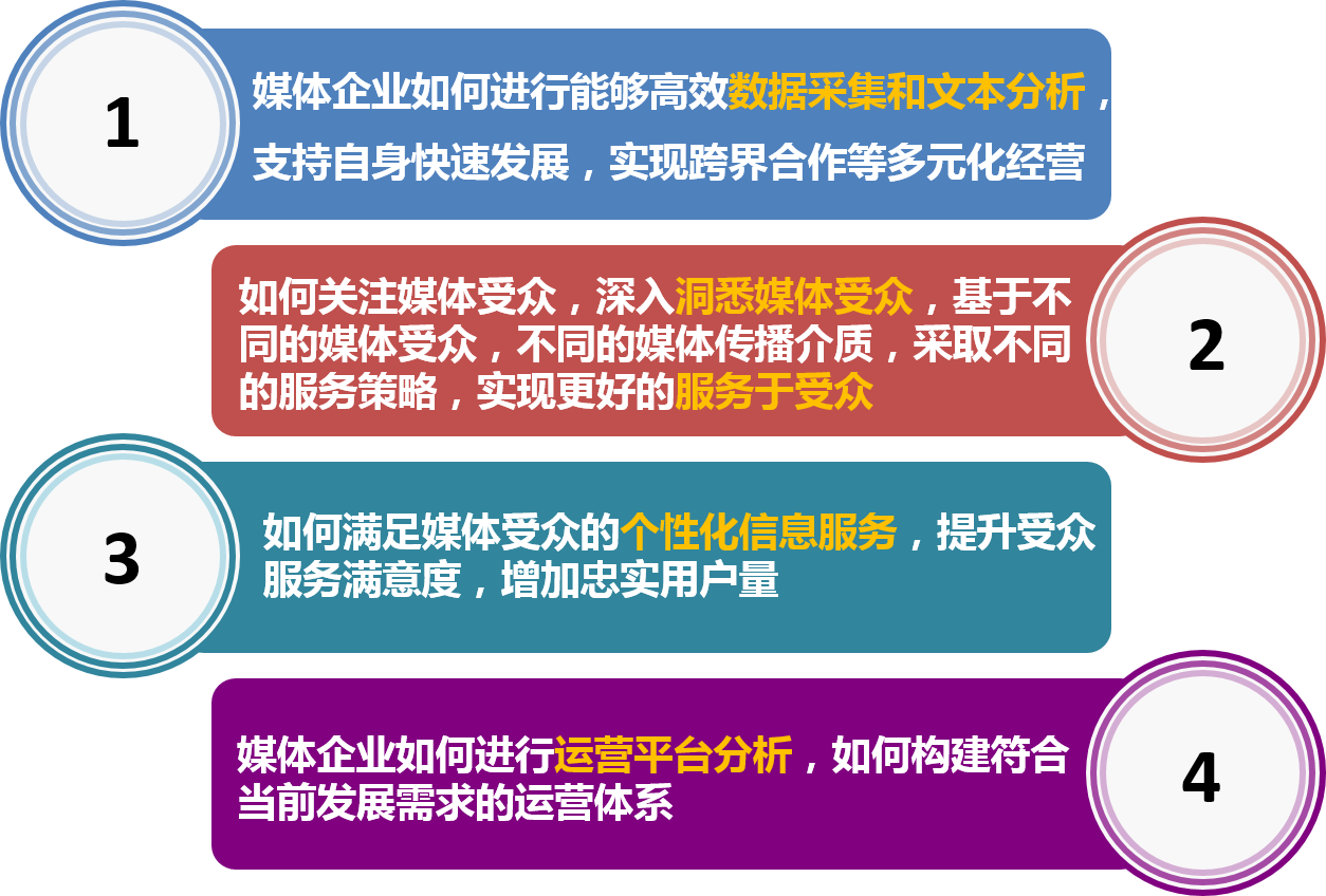 大数据时代,媒体面临四大挑战。其一,如何对每日海量的数据进行采集,并对海量的文本信息进行梳理,最终形成有逻辑的数据资产,为自身发展提供数据支撑。其二,以用户为核心的用户体验以深入媒体未来的发展方向,如何能够快速、精准、全面的洞悉媒体受众用户需求,将成为媒体市场价值的衡量标准。其三,面对海量的媒体信息,如何帮助用户快速准确的获得需要的资讯,已成为媒体必备的能力之一,通过个性化信息服务能力实现忠实用户的不断递增。其四,媒体企业急需掌握自身受众的传播情况,并对自身运营模式进行优化改进,进一步完善媒体企业自身竞争力,掌握媒体行业市场发展的最新动向。