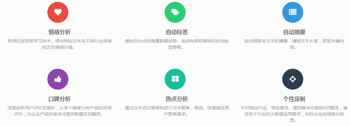 百分点企业级文本分析平台为企业客户提供一站式的商用文本分析服务,赋予企业文本分析的能力,满足企业个性化、复杂、频繁调整的非结构化文本分析需求,帮助企业对文本进行挖掘和结构化。可视化结果展现让您瞬间获取商业洞察,挖掘海量的商业价值,譬如舆情监控、消费者分析、品牌分析、精准营销等等。适用于零售、金融、家电、汽车等行业的企业客户、政府机构、以及各种合作伙伴,为企业提供了坚实的解决方案,让您发现并揭示那些前所未知的模式、情感和联系。