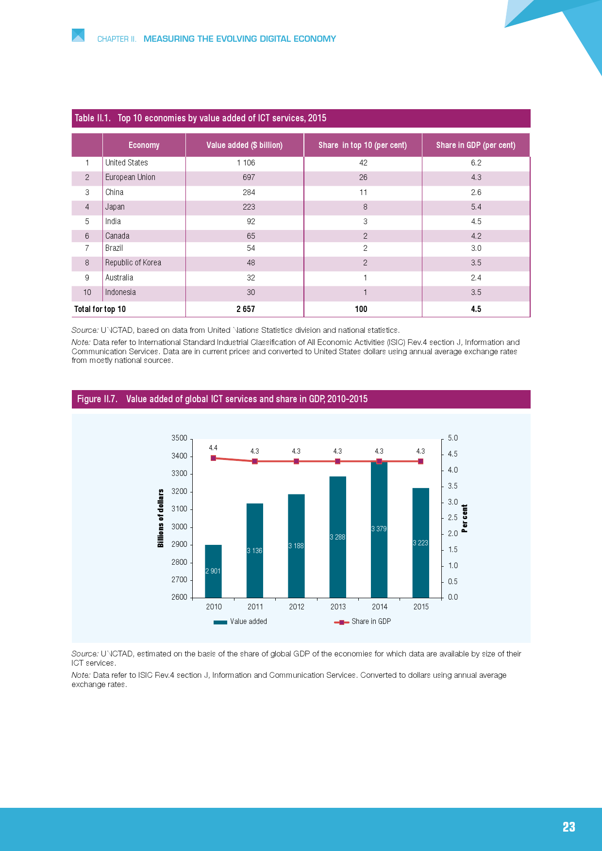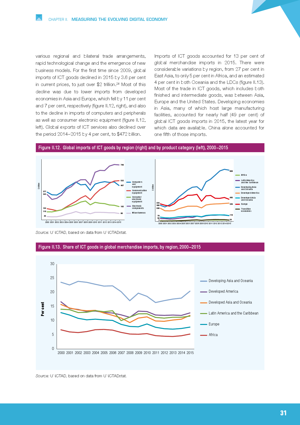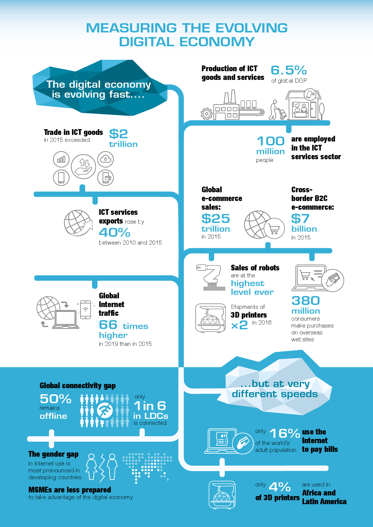 基图伊:“数字经济以超出我们预测的速度呈指数比例地在扩张。仅在2012到2015年之间,数字经济的规模从1万6000亿美元增长到2万5000亿美元,而且数字经济产生的一些颇具规模的现象也应引起全球讨论。例如,信息和通信技术产品与服务的生产占全球国内生产总值的比例达到了6。5% ,在2010年到2015年之间,信息和通信技术服务的出口量迅猛增长了40% ,三维打印机的出货量预计将从2016年的45万台增长到2020年的670万台,在三年的时间内会增长15倍。同时,到2019年,全球互联网的流量预计将是2005年的66倍。”