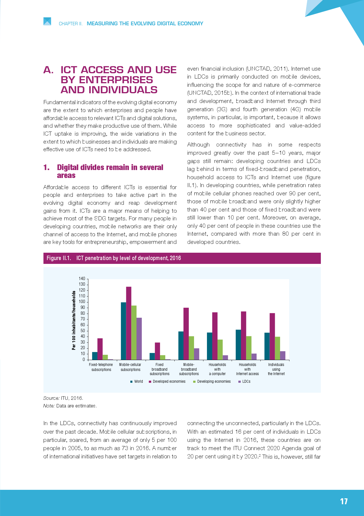 报告指出,世界还有一半以上的人口依然没有上网,而且网络的接入和使用的增长速度正在放缓。在最不发达国家,2016年只有六分之一的人使用互联网,这些国家将难以实现到2030年普及互联网接入的可持续发展目标。此外,城乡差距显著, 3G网络覆盖89%的城市地区,但农村地区只有29%的覆盖率;互联网的性别差距在发展中国家最为明显。非洲和拉丁美洲仅占全球4%的3D打印机;在非洲,只有不到40%的国家制定了数据隐私法,而在大洋洲,只有库克群岛有这样的立法。