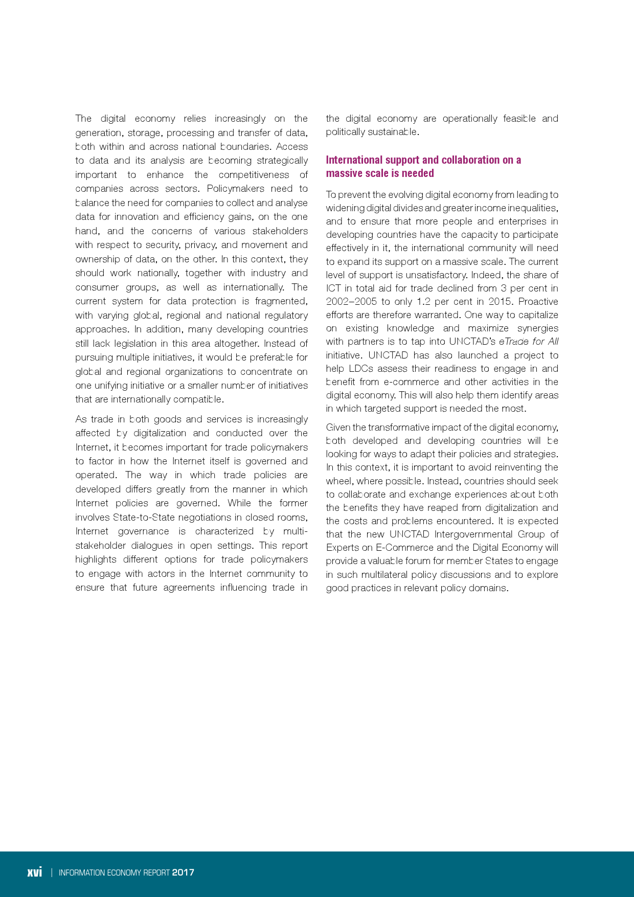 随着数字化的进一步发展,数据流在公司的运营中扮演着越来越重要的角色,商业界和互联网政策制定者将需要开展更加密切的对话。政策挑战取决于各国是否愿意从数字经济中受益,而最不发达国家在这方面是最欠准备的。