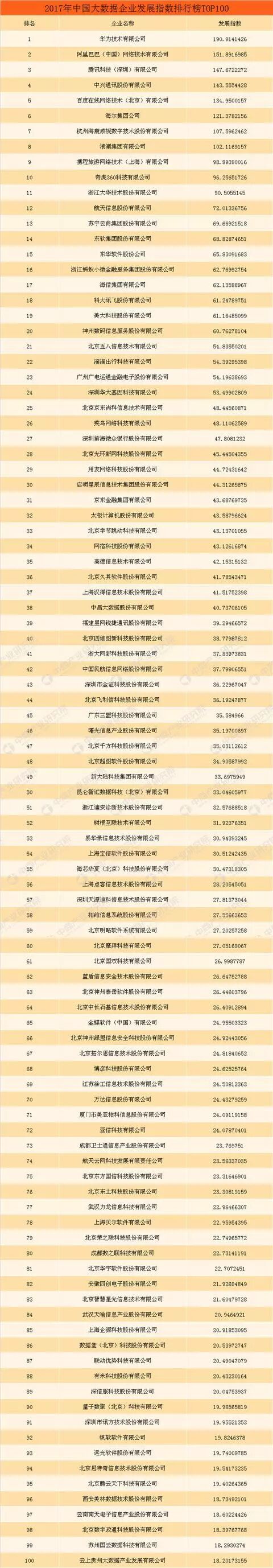 在2017年中国大数据企业发展指数排行榜TOP100中,大数据企业发展指数百强榜单的变动率整体较大,新晋企业达到19家,其中以蚂蚁金服、滴滴出行、新美大、菜鸟网络等为代表的独角兽企业首次入榜,并强势入围30强;以智慧星光、量子数聚、腾云天下为代表的大数据专业厂商首次入围百强榜;以树根互联、徐工信息为代表的工业互联网平台服务提供商也首次入围榜单。