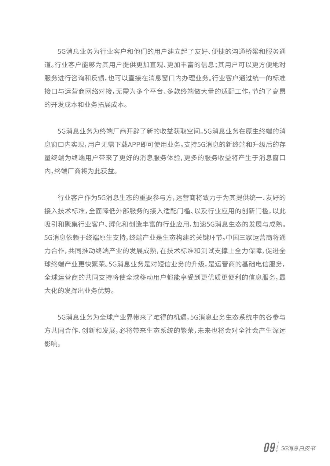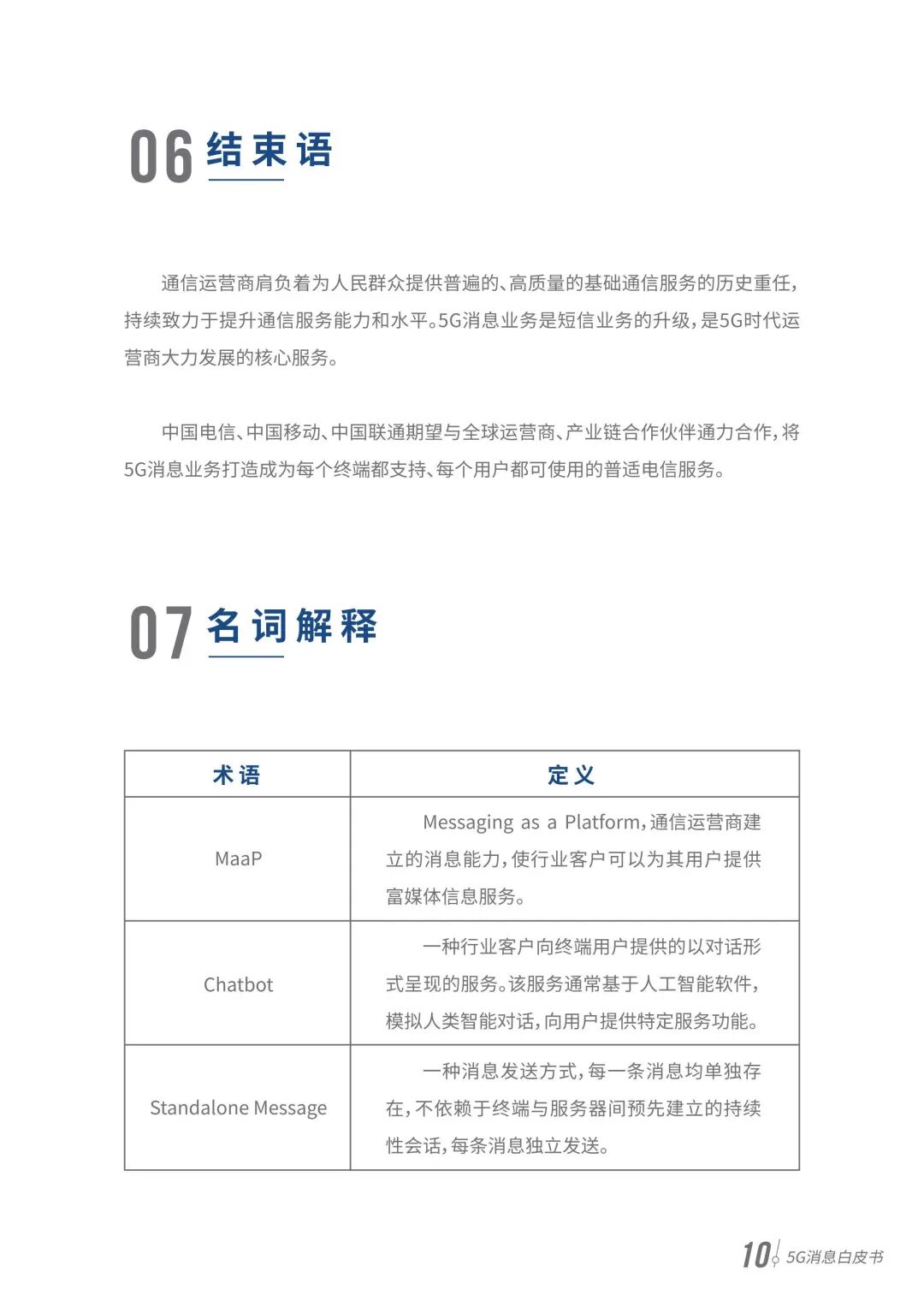 本次《5G消息白皮书》的发布,展现出三大运营商大力发展5G消息业务的能力与决心。下一步,中国联通、中国移动、中国电信将与全球运营商及产业合作伙伴通力合作,将5G消息业务打造成为多终端支持、广用户覆盖、多行业赋能的5G普适性信息通信服务,以促进消息类业务价值提升,驱动全球5G产业生态繁荣发展。