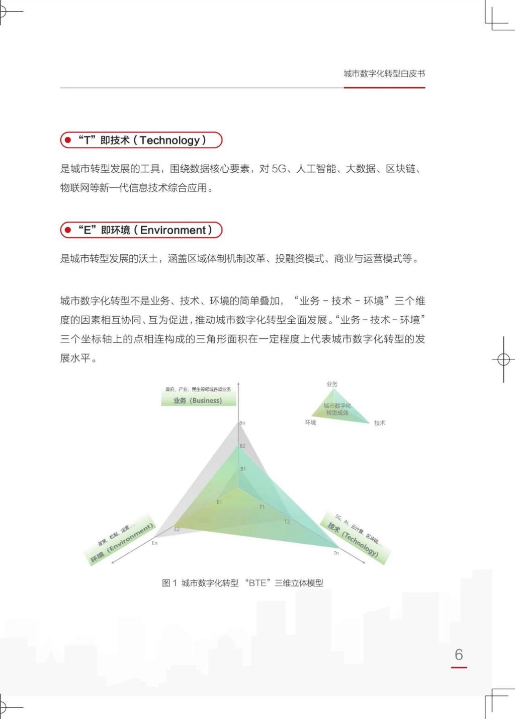 《白皮书》提出,城市数字化转型本质上是 " 以业务价值提升为导向,以机制体制优化为保障,以技术创新应用为手段,最终提升城市面向未来的综合竞争力 " 的城市发展新范式。推进城市数字化转型,须贯彻以人为本的建设初衷,回归城市服务于人和社会发展的功能本质,重新梳理构建业务发展逻辑,充分发挥技术的合理性、融合性、创新性特征,谋划适配发展的转型环境,实现通过业务、技术、环境三大因素彼此协同、相互促进,推动城市加快数字化转型进程。