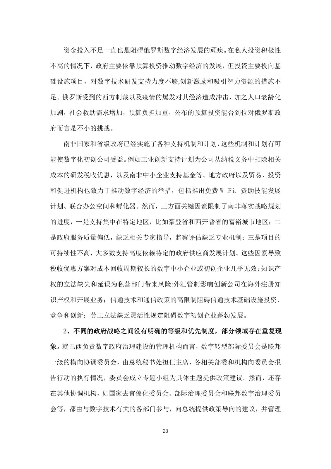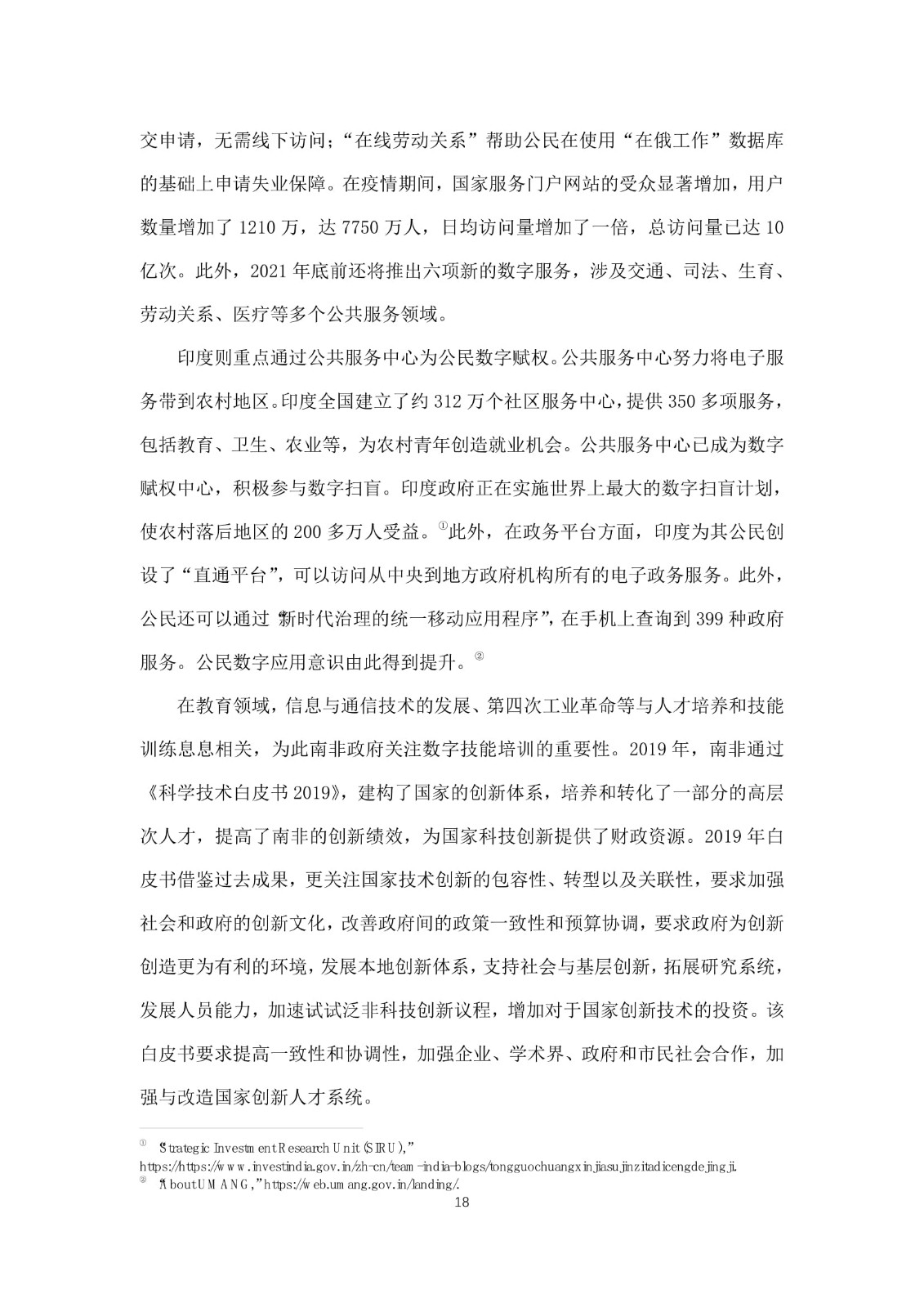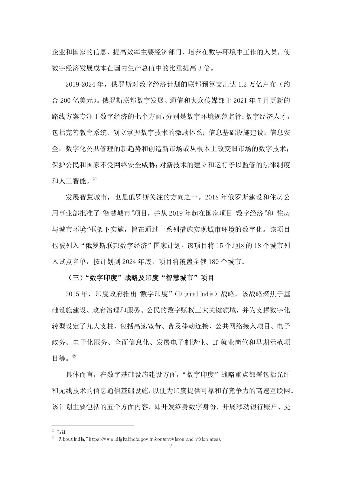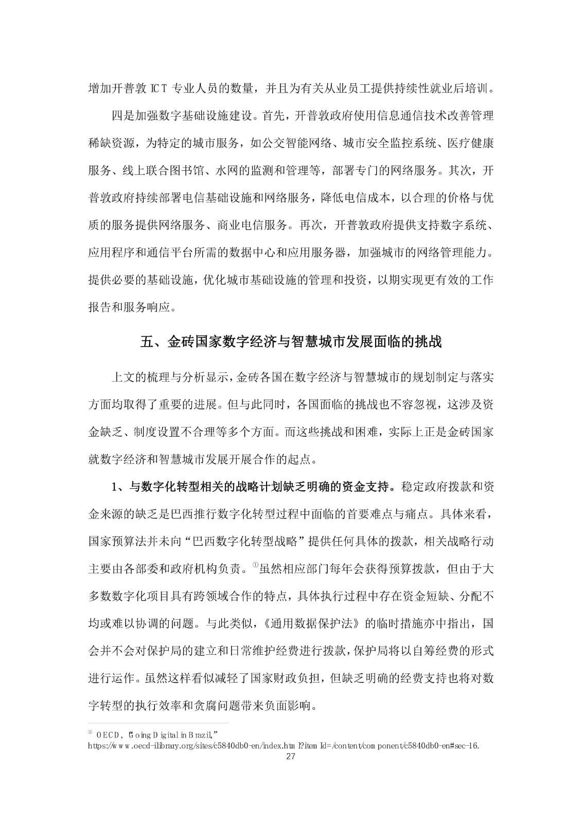 不久前达成的《金砖国家数字经济伙伴关系框架》指出,“金砖国家在数字经济领域具有共性和互补性,需要探讨探索利用数字机遇,加速数字化转型,打造可持续发展的新动力”。与此同时,“金砖成员数字发展水平不同,金砖国家合作需要聚焦弥合数字鸿沟,确保数字化普惠性和应对挑战”。 报告指出,受产业结构转型的需求、可持续发展目标及信息通信技术进步的驱动,金砖各国近年来都制定了数字经济和智慧城市的发展战略规划。缩小国内的数字鸿沟,利用数字技术解决城市化进程中面临的问题,使金融、教育、医疗等方面的发展更好地惠及民众,都是各国战略规划设定的关键目标。金砖各国对于战略规划的实施均已取得一定成果,但同时也面临着缺乏资金支持等问题和挑战。