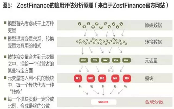 图5展示了ZestFinance的信用评估分析原理,融合多源信息,采用了先进机器学习的预测模型和集成学习的策略,进行大数据挖掘。首先,数千种来源于第三方(如电话账单和租赁历史等)和借贷者的原始数据将被输入系统。其次,寻找数据间的关联性并对数据进行转换。再次,在关联性的基础上将变量重新整合成较大的测量指标,每一种变量反映借款人的某一方面特点,如诈骗概率、长期和短期内的信用风险和偿还能力等。然后将这些较大的变量输入到不同的数据分析模型中去。最后,将每一个模型输出的结论按照模型投票的原则,形成最终的信用分数。
