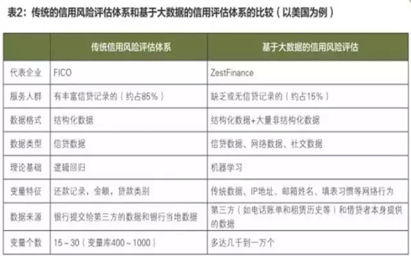如表2所示,将这种将基于大数据技术的信用评估体系和传统信用评估(以美国的征信体系为例)相比,发现主要的区别有以下几个方面。