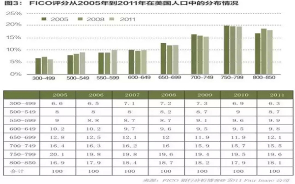 虽然FICO评分仍然体现风险排序,但其预测绝对风险的能力和在2008年金融危机中的表现饱受指责,图3展示,FICO分数从2005年到2011年在美国人口中的分布基本上没有大的变化,这和2008年金融危机爆发之后出现大量坏账的现实严重不符。